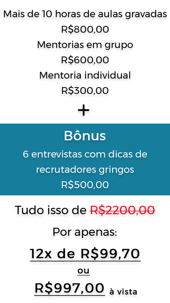Te ajudar a dar seus primeiros passos na carreira internacional remota, te ensinando os fundamentos básicos para conseguir ser chamado para encontrar vagas lá fora e fazer sua aplicação.